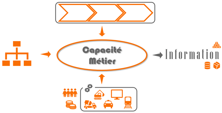 La difficulté ici dans un cadre de pilotage est le besoin en données qui dépassent celui des capacités métiers. Comme nous l’avons vu à la figure 1 dans d’autres articles (cfr article « Modéliser les business capabilities« ), nous savons que le cadre d’une capacité métier est composé de processus, de flux d’information, de moyens (au sens RH, financiers, IT à réaliser et à adapter, voire à décommissionner), d’informations, d’organisations (au sens rôles et responsabilités – R&R) …