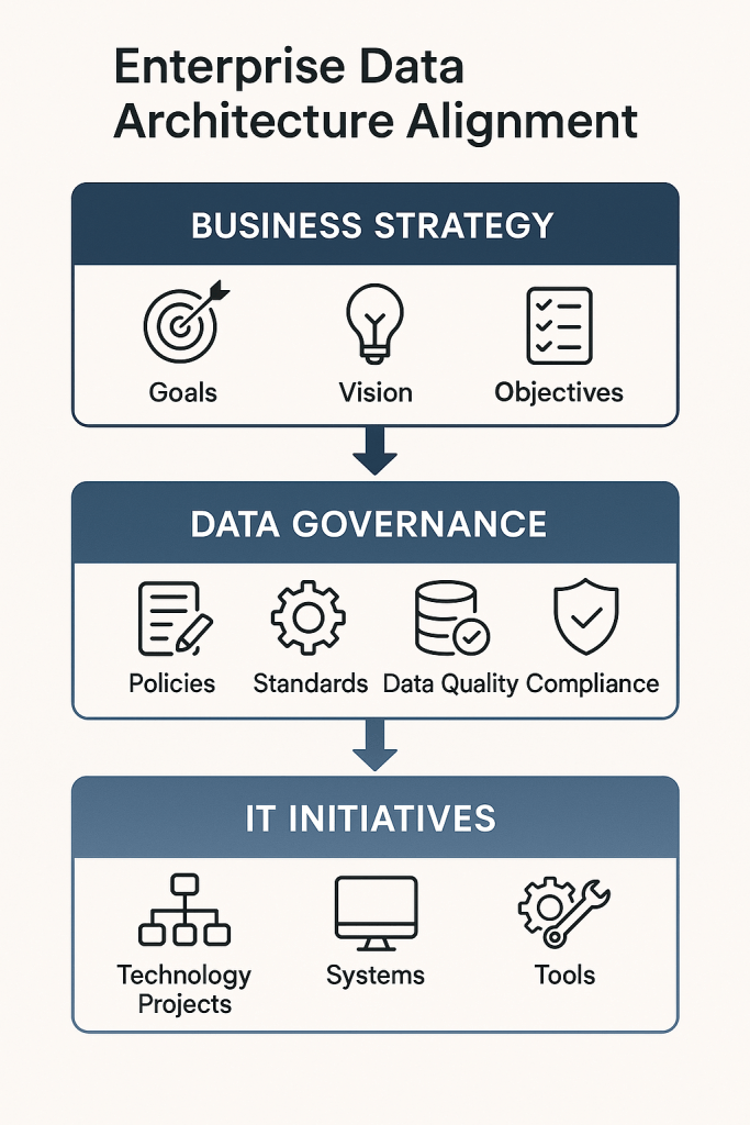 L’architecture data est intrinsèquement liée à la stratégie globale de l’entreprise. Elle n’est plus une conséquence, mais une composante active de la planification stratégique. Selon le framework TOGAF, toute architecture doit commencer par une « Architecture Vision » (Phase A de l’ADM) qui découle directement des objectifs métiers (Business Goals, Drivers, and Objectives).