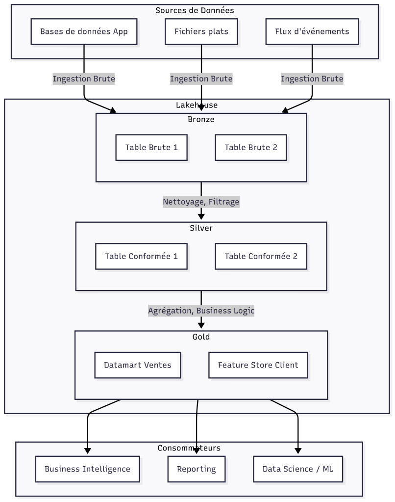 Pour organiser les données au sein du Lakehouse, l’architecture Médaillon est une pratique courante. Elle structure les données en trois couches logiques, correspondant à des niveaux croissants de qualité et de transformation.