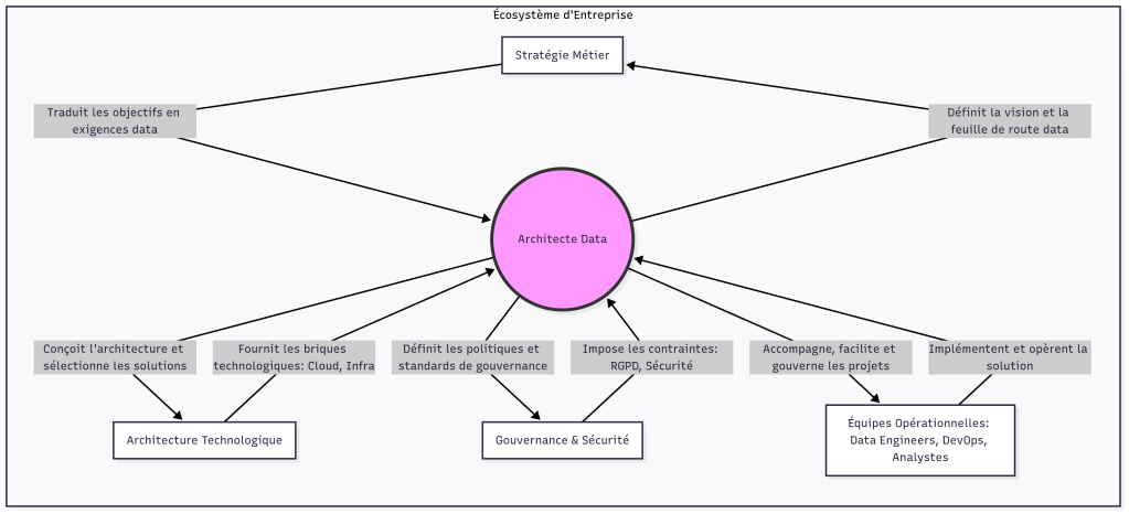 L’architecte Data n’opère pas en silo. Il est le pivot qui connecte la stratégie d’entreprise aux réalités techniques et opérationnelles. Son positionnement est au cœur d’un écosystème complexe, comme l’illustre le schéma ci-dessous.